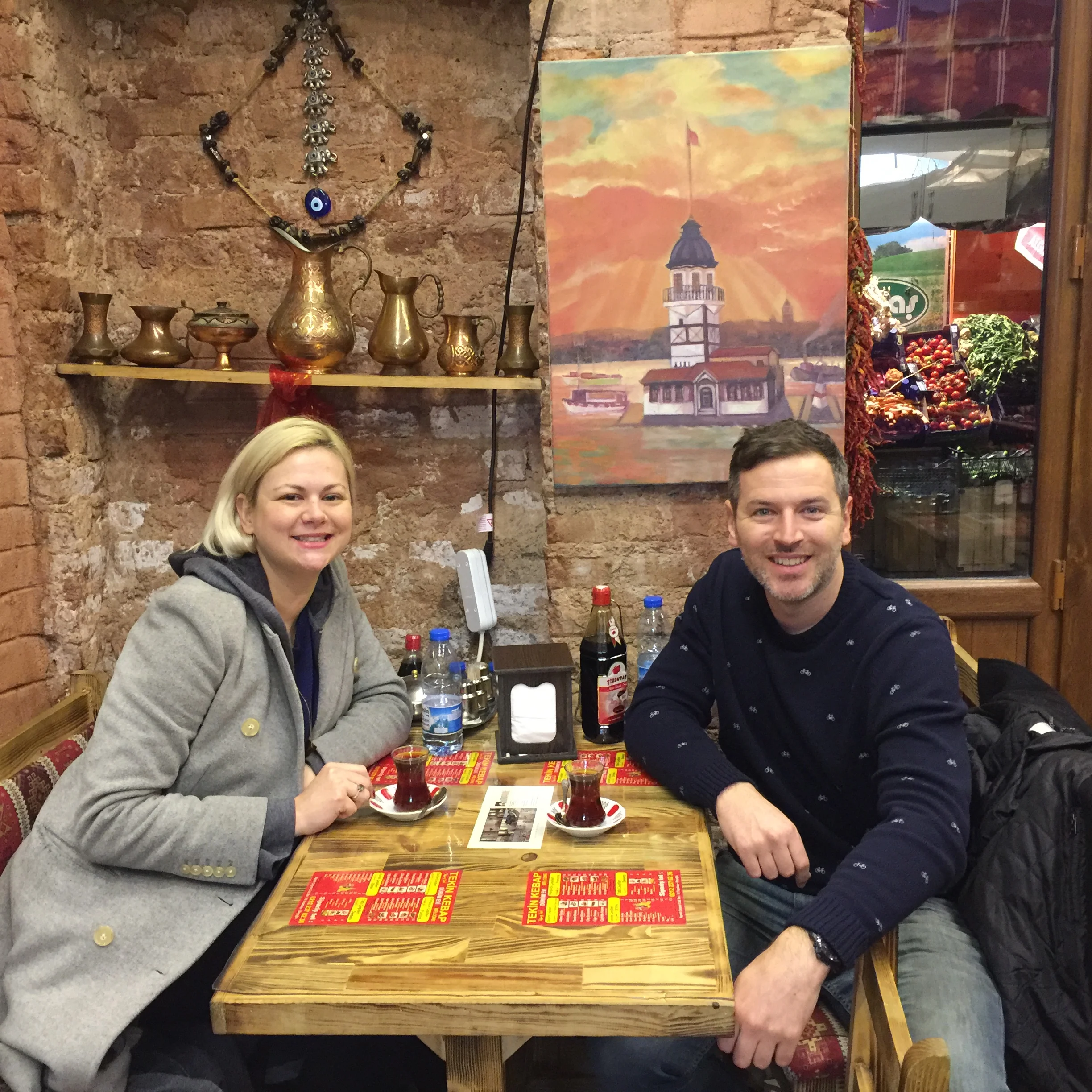 The palace turned out to be a little too puddly for kneeling, so after some lunch in Asia, they headed back and shopped for souvenirs and Turkish Delights at the Grand Bazaar. Since most of the city was without power, they decided to call it an early night and walked back to their AirBnB apartment through the dark cobblestone streets, stopping at the candle-lit corner store for some turkish beer to take home.
